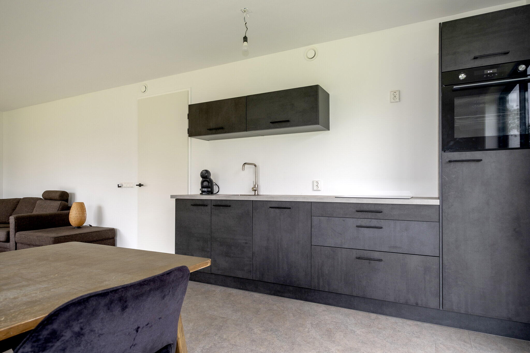 Entree in hal met meterkast en toilet. De hal fungeert als centrale ruimte. De royale woonkamer (ca. 32 m²) met open keuken (ca. 7 m²) heeft een schuifpui die toegang biedt tot de ruime veranda, vanwaar je een prachtig vrij uitzicht hebt. De moderne keuken is voorzien van diverse inbouwapparatuur, waaronder een koel-vriescombinatie, inductieplaat, combi oven/magnetron en vaatwasser. De bijkeuken is uitgerust met de technische installaties en witgoedaansluiting en heeft voldoende bergruimte. De woning beschikt over twee slaapkamers (ca. 21 m² en 12 m²) en een moderne badkamer met inloopdouche en wastafelmeubel.