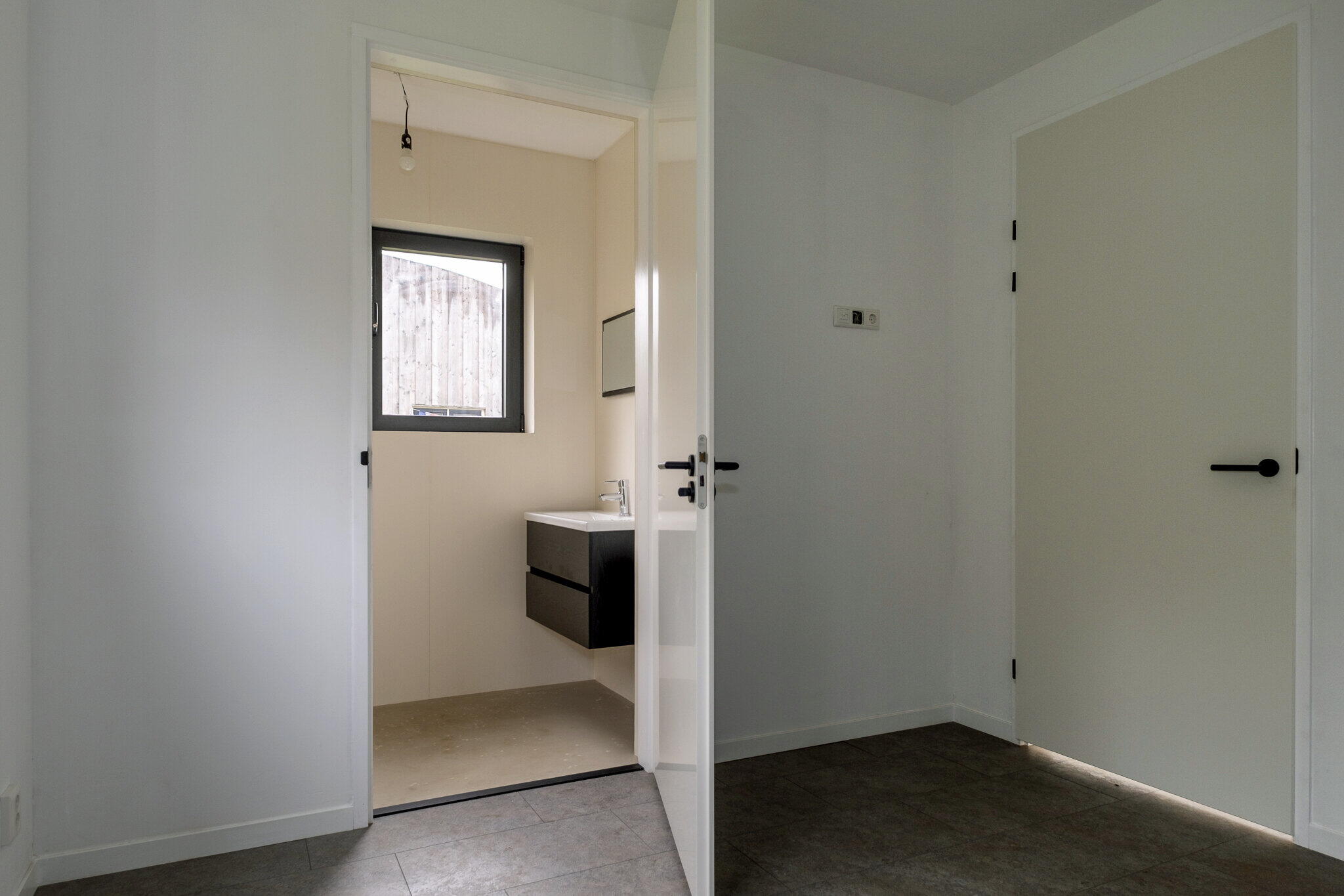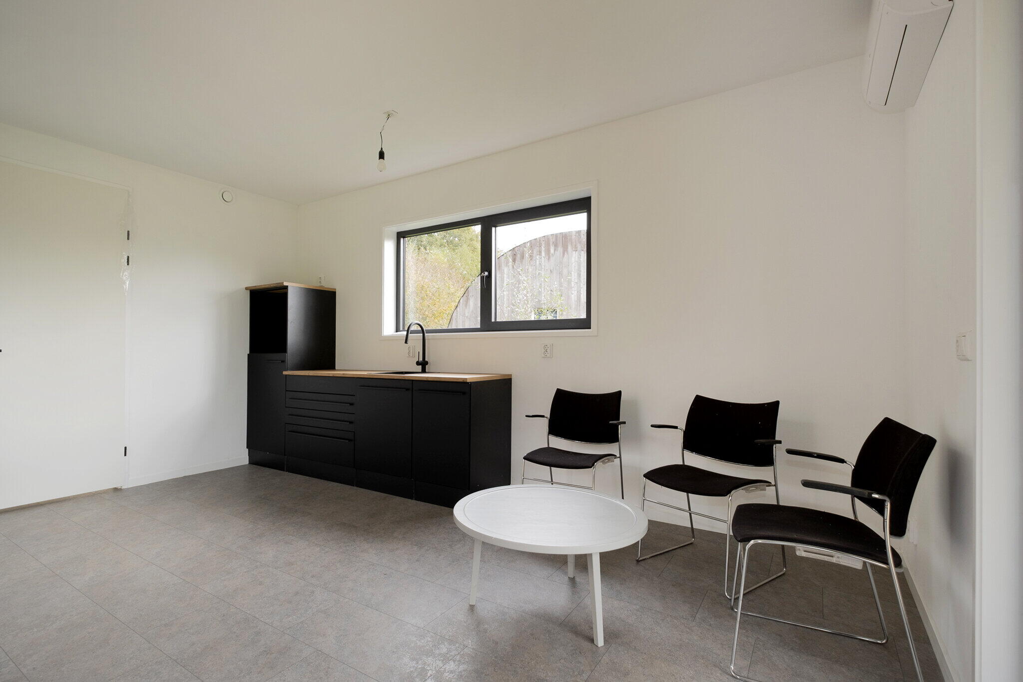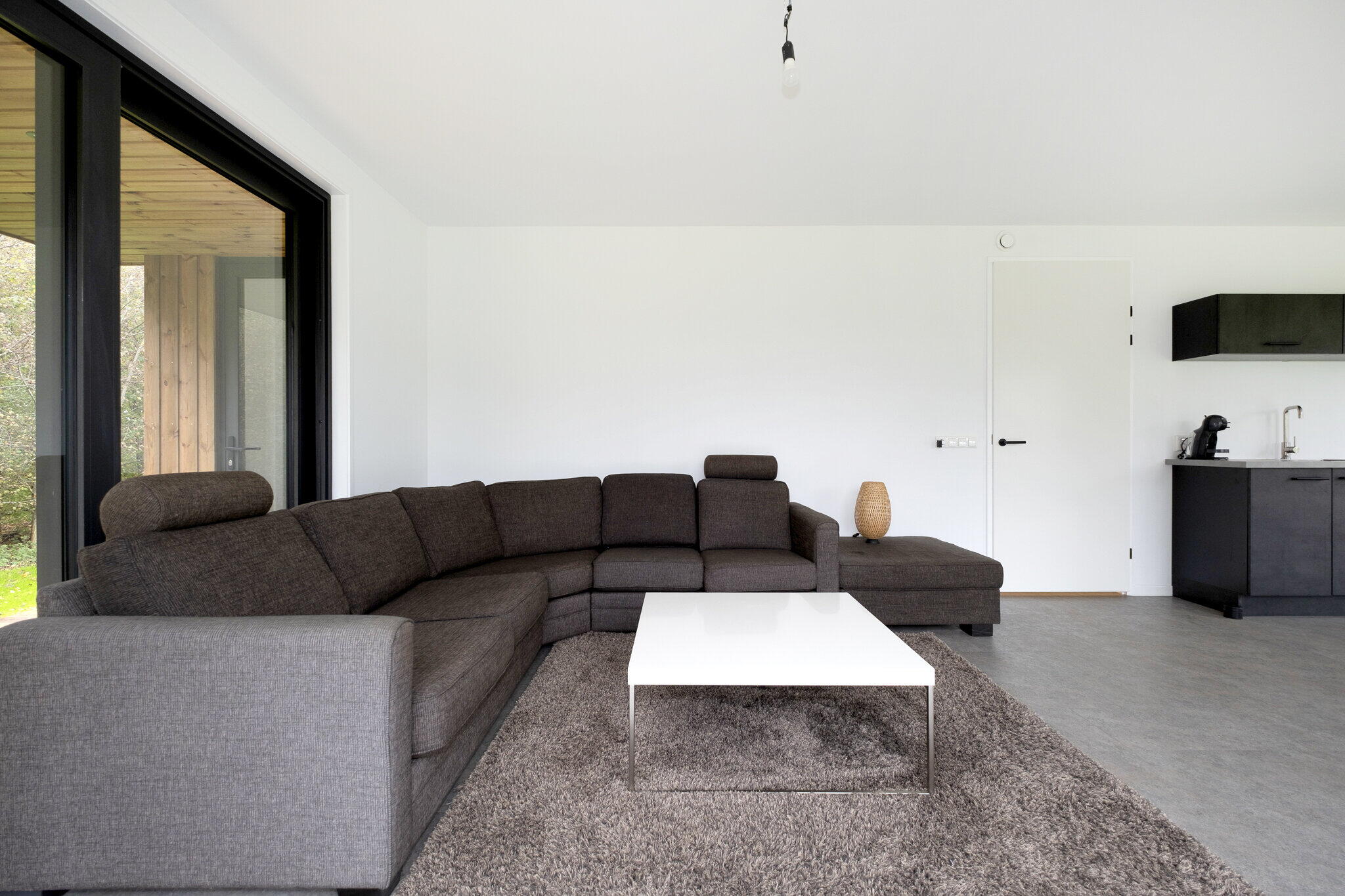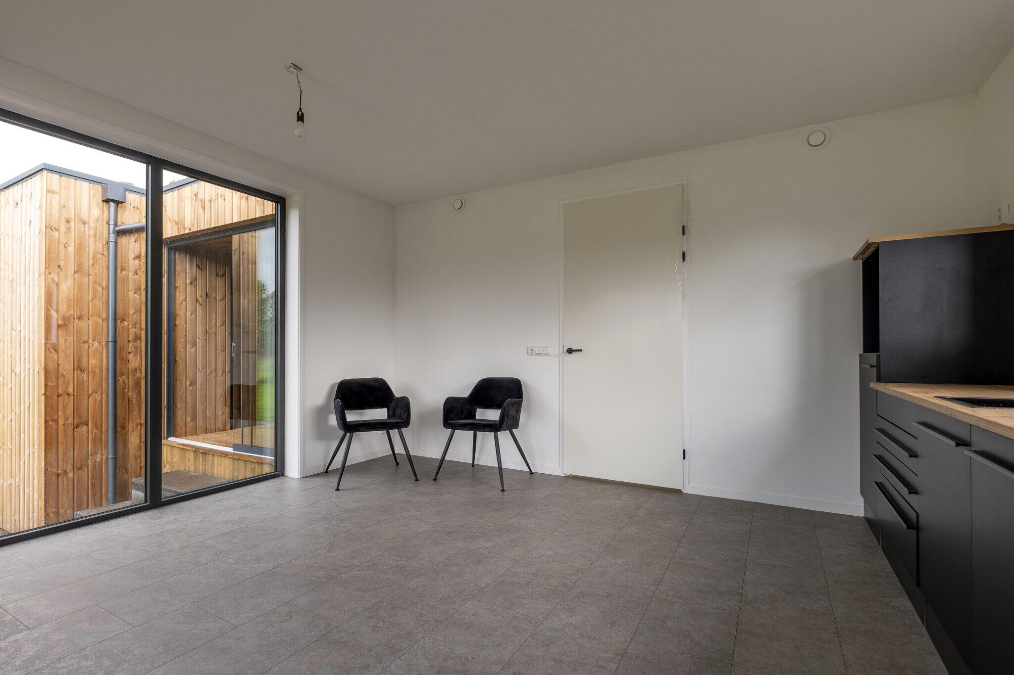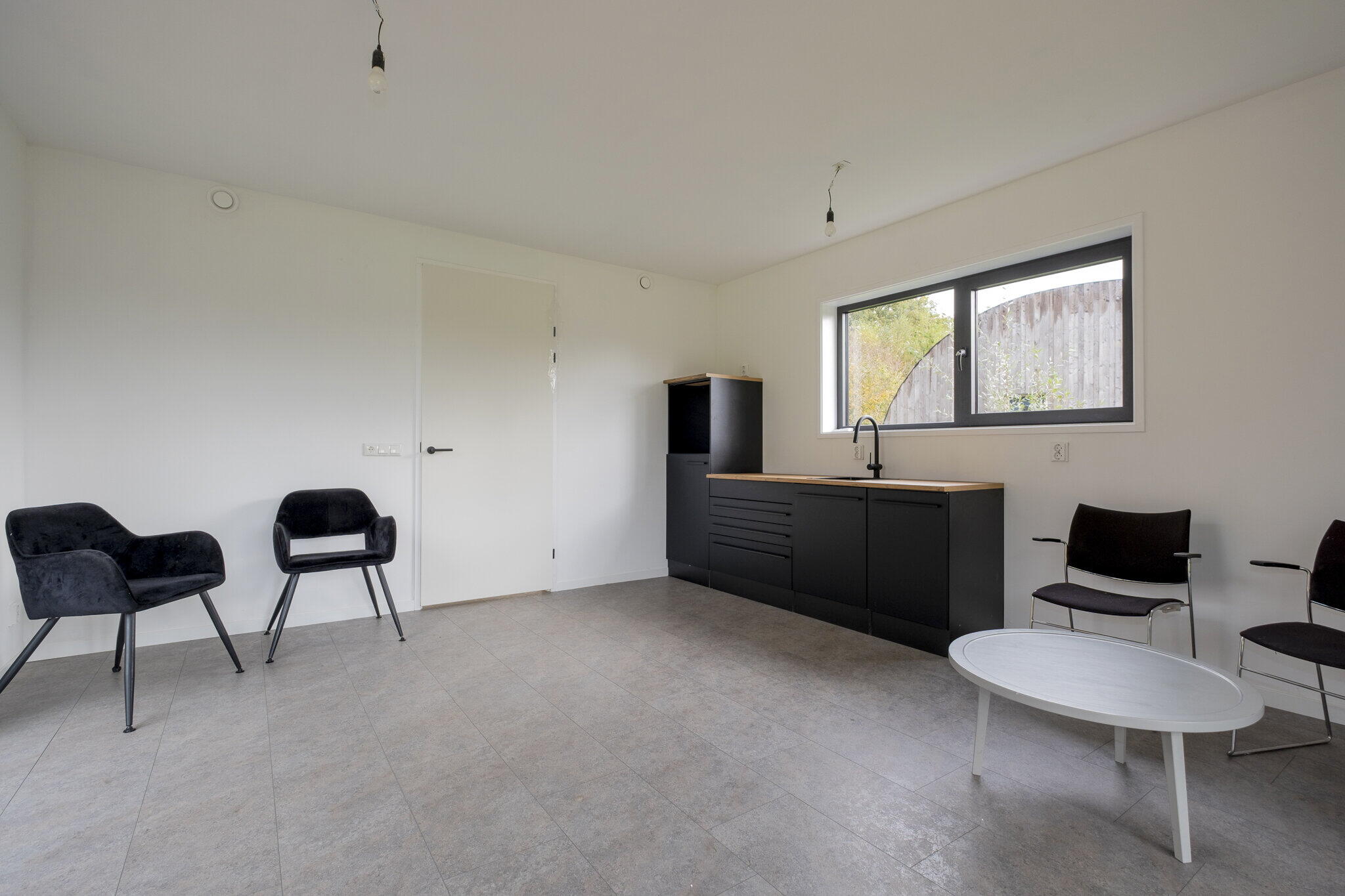 Via een overkapt tussenportaal, die aan beide zijdes door een schuifpui geopend kan worden, is het bijgebouw bereikbaar. Deze ruimte is voorzien van een woonkamer met pantry (ca. 22 m²), een slaapkamer (ca. 11 m²), een badkamer met douche en wastafelmeubel en een separaat toilet. Aan de voorzijde biedt een schuifpui vanuit de woonkamer toegang tot de overdekte veranda.