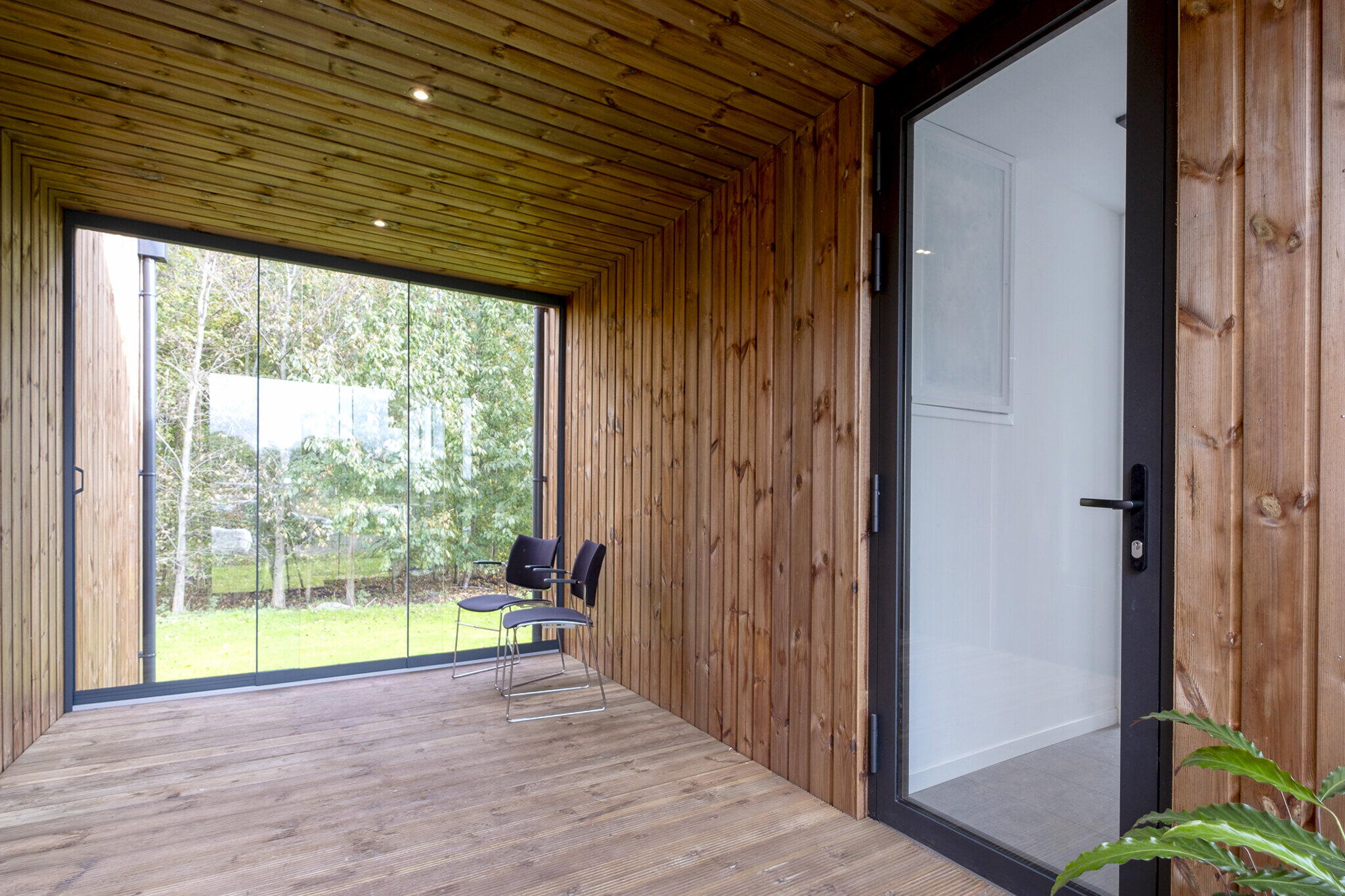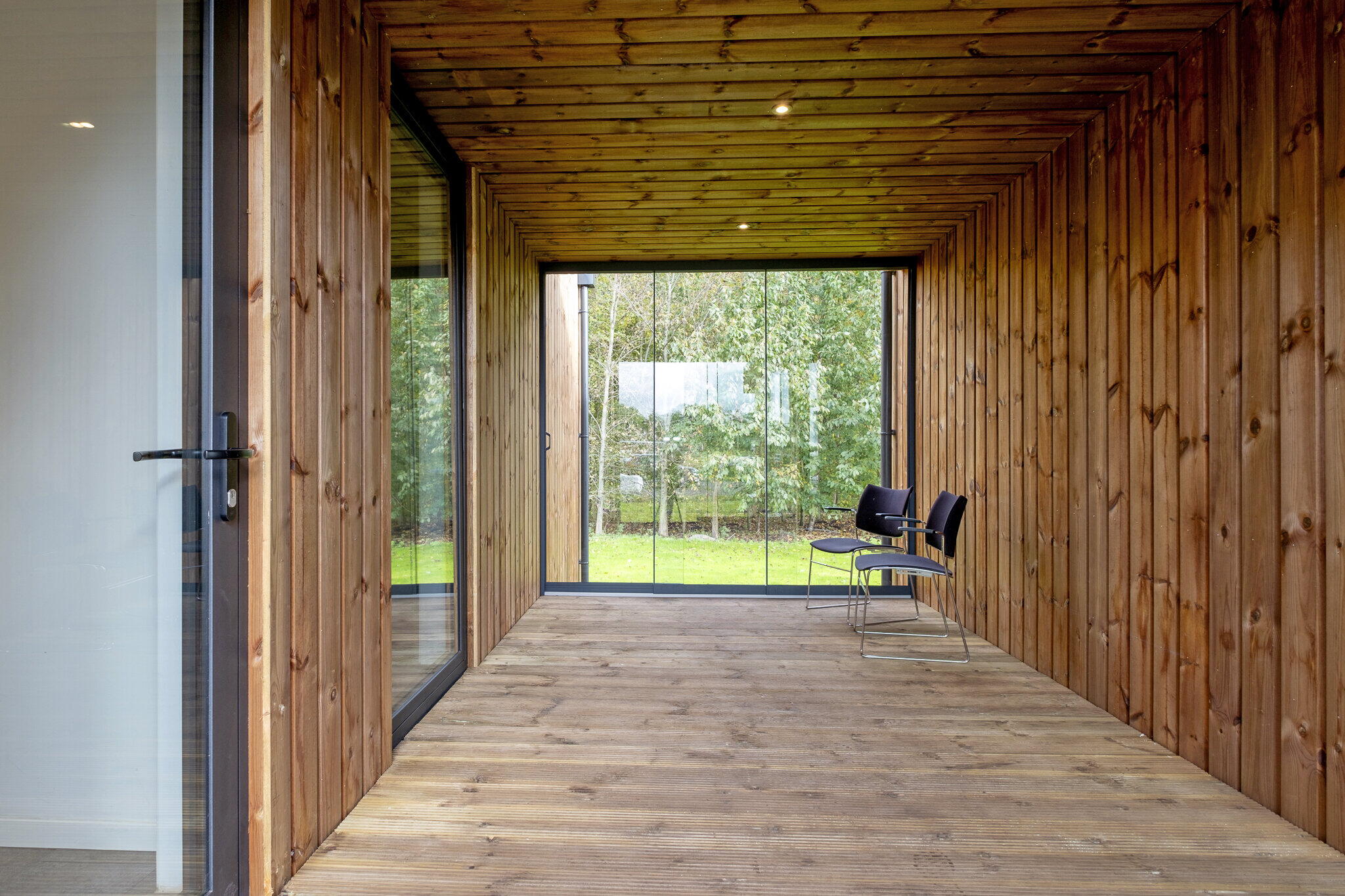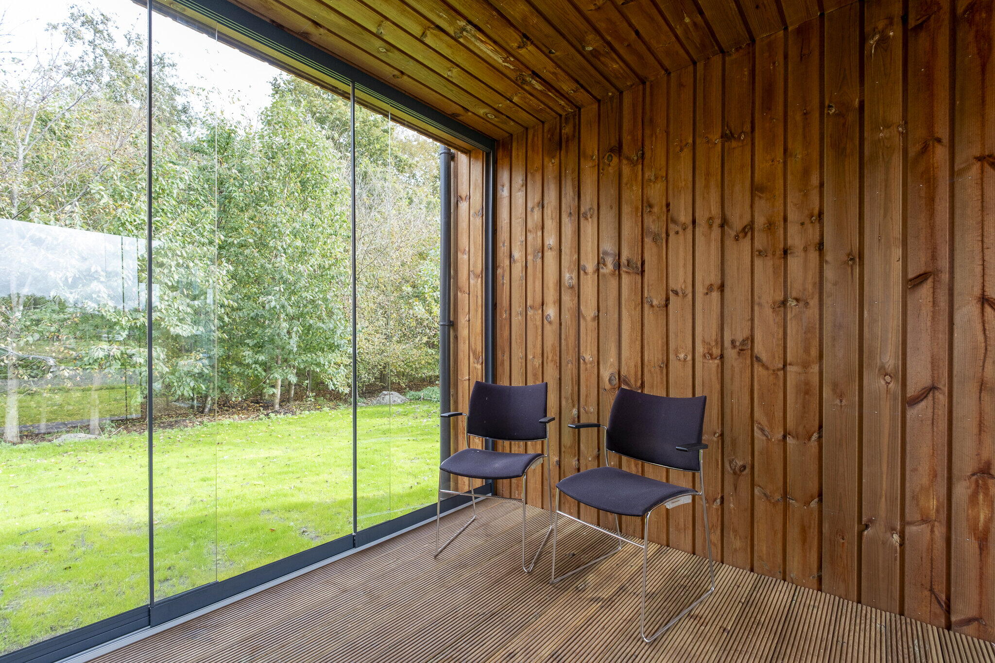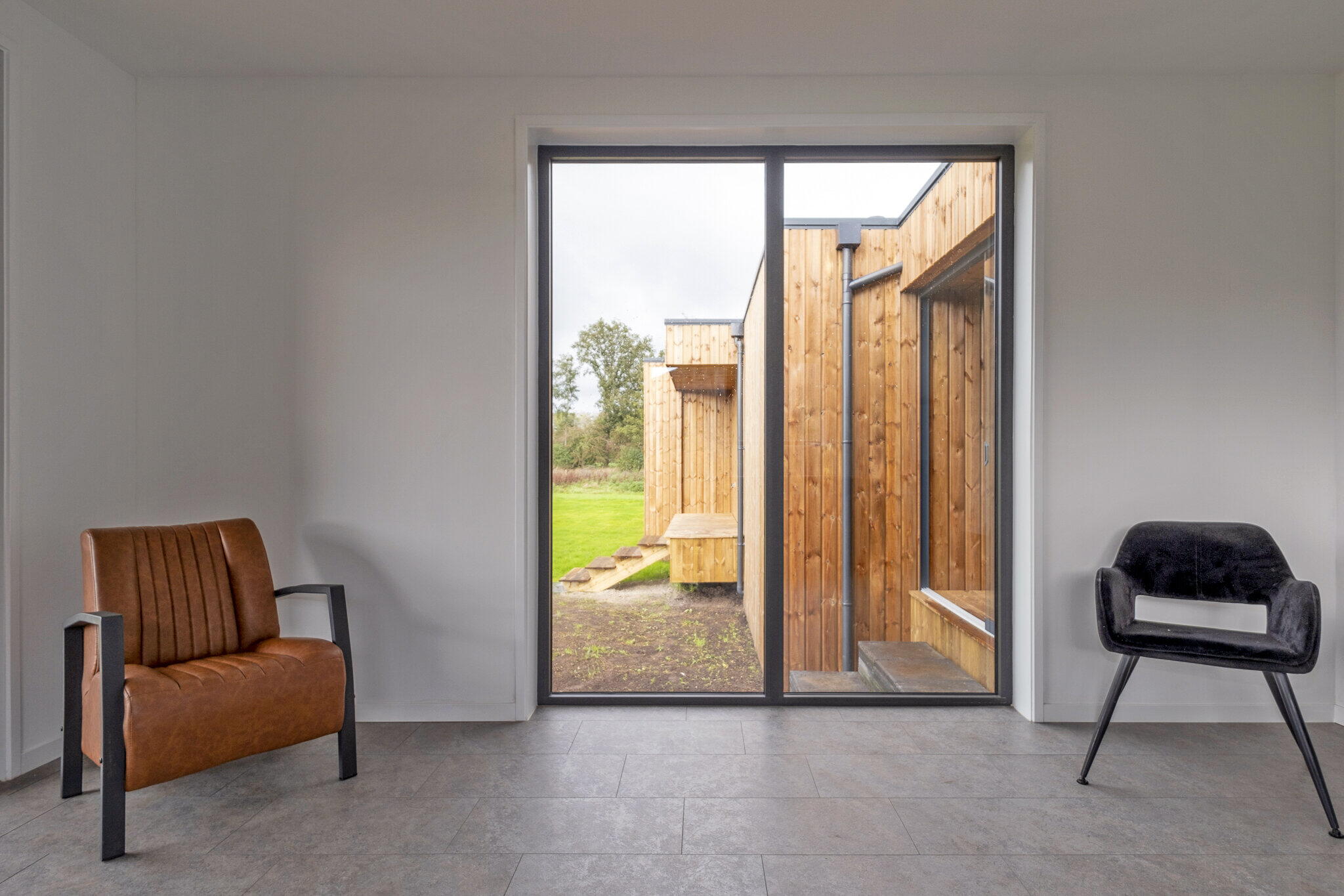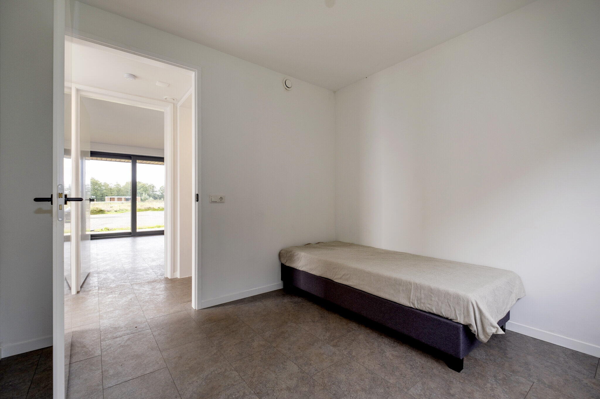 Via een overkapt tussenportaal, die aan beide zijdes door een schuifpui geopend kan worden, is het bijgebouw bereikbaar. Deze ruimte is voorzien van een woonkamer met pantry (ca. 22 m²), een slaapkamer (ca. 11 m²), een badkamer met douche en wastafelmeubel en een separaat toilet. Aan de voorzijde biedt een schuifpui vanuit de woonkamer toegang tot de overdekte veranda.