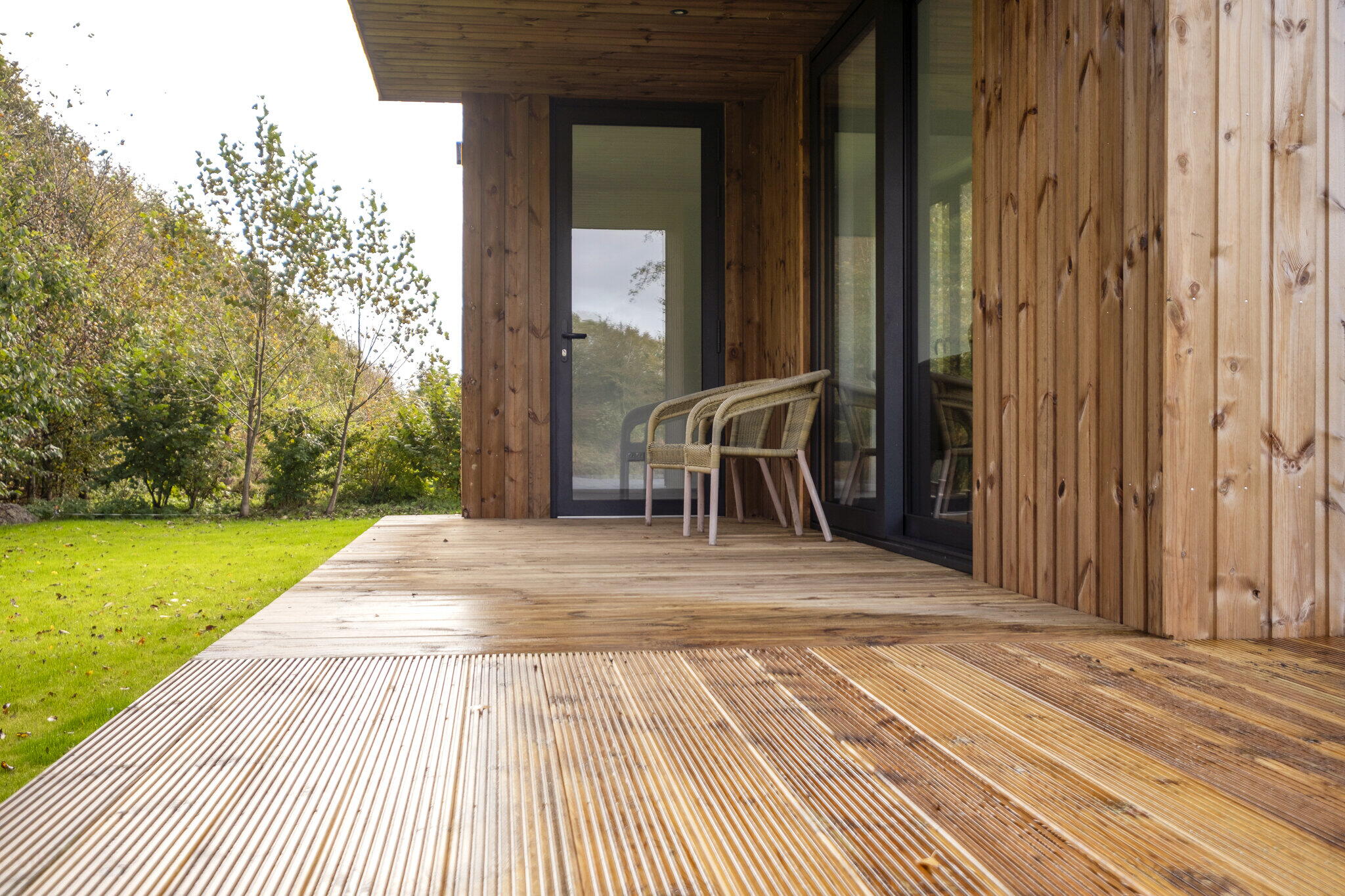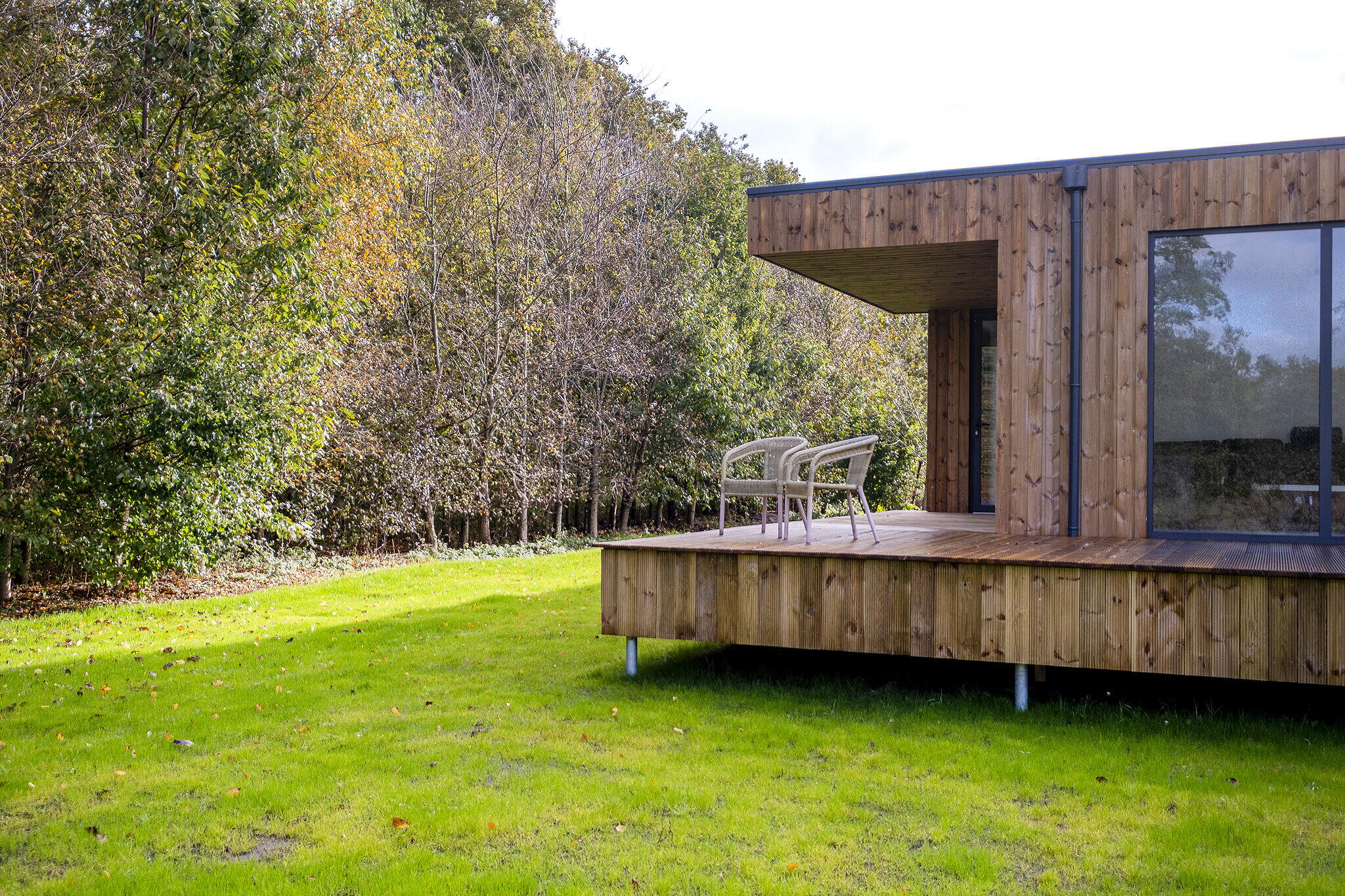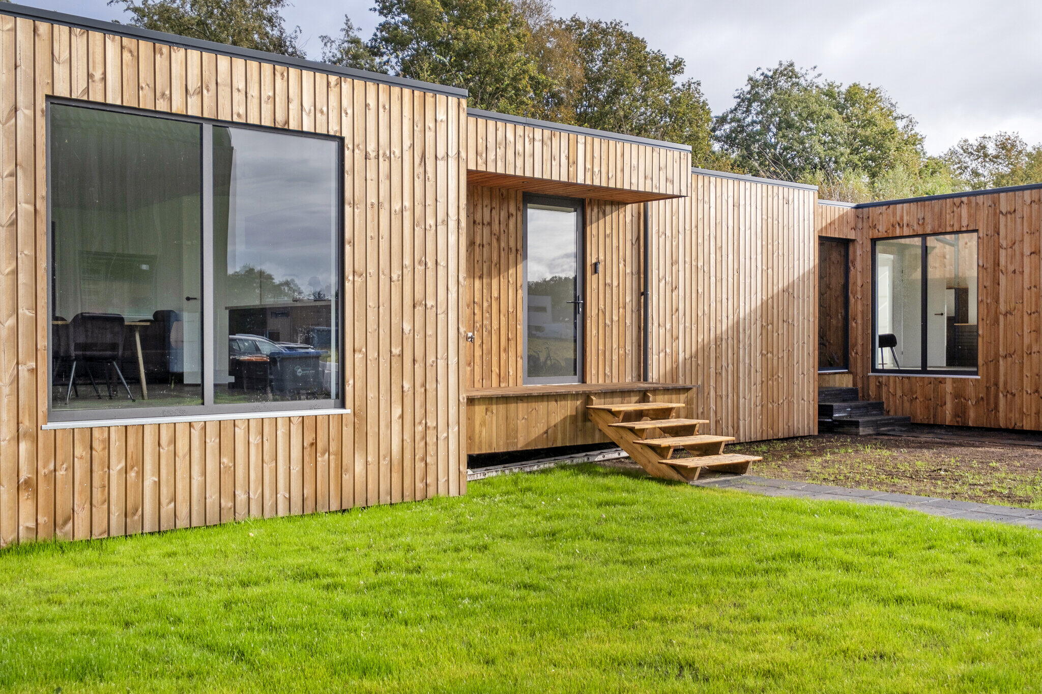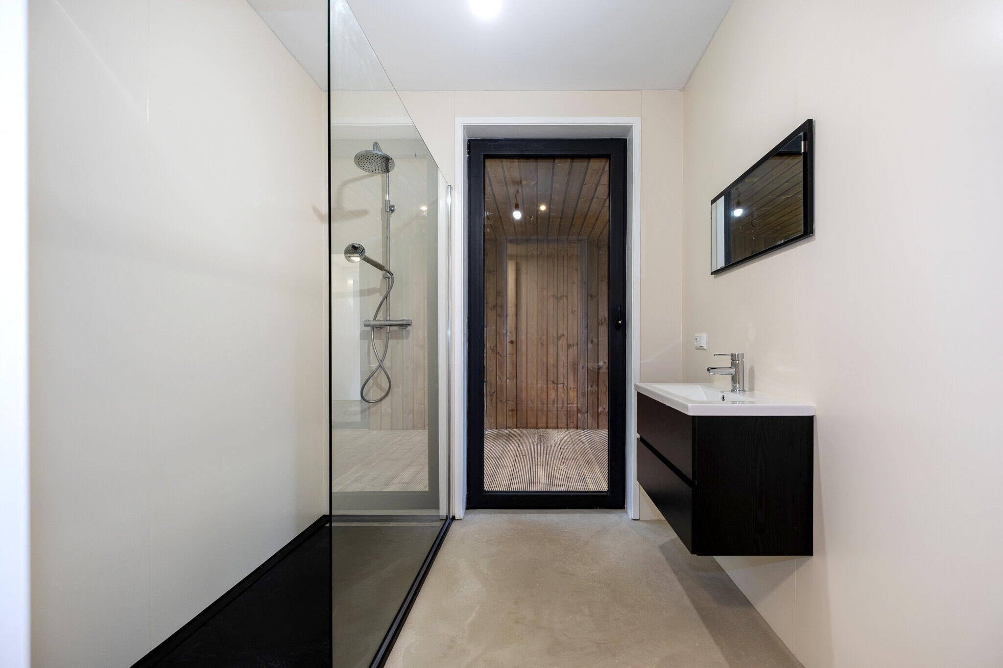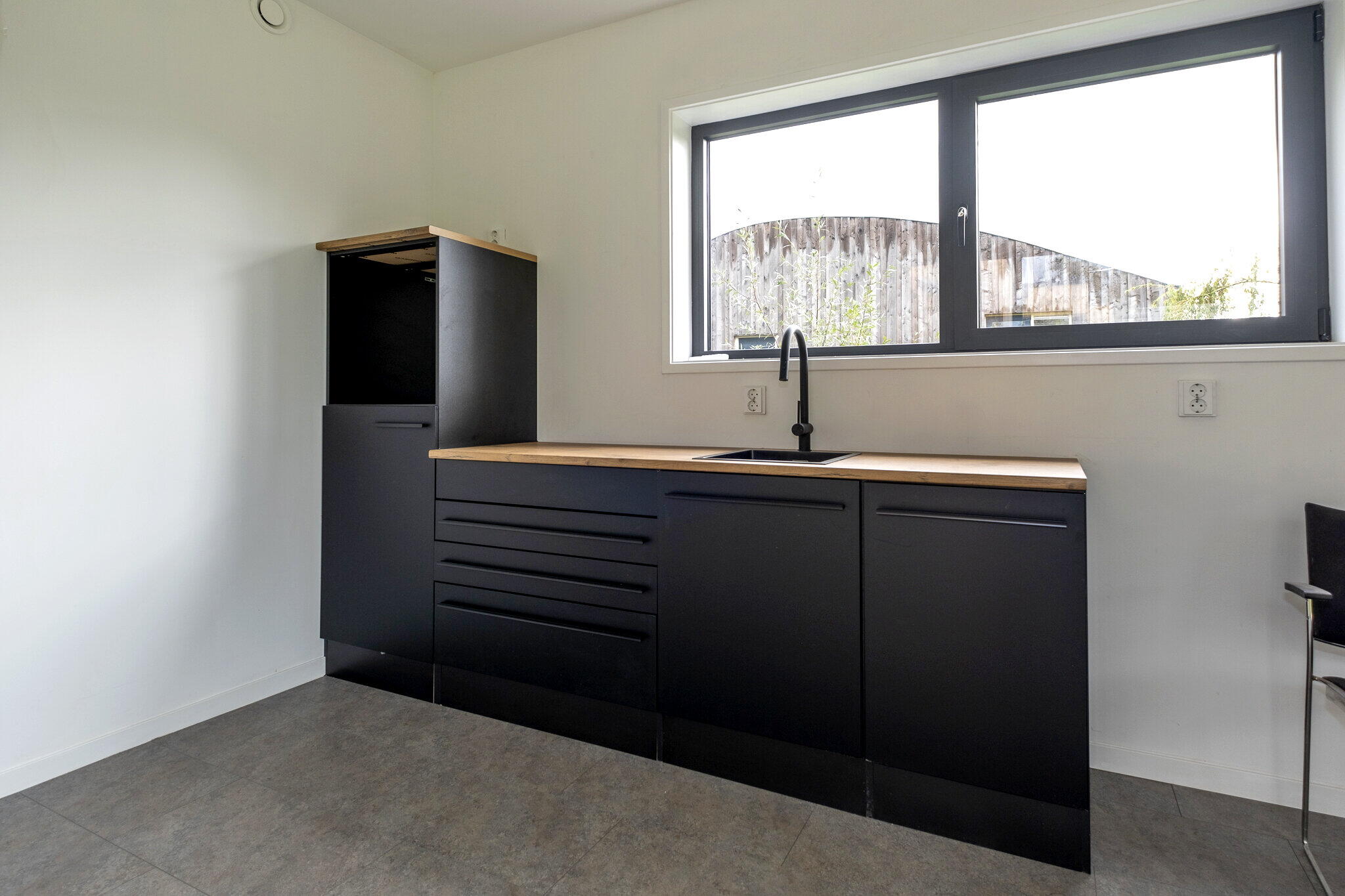 Via een overkapt tussenportaal, die aan beide zijdes door een schuifpui geopend kan worden, is het bijgebouw bereikbaar. Deze ruimte is voorzien van een woonkamer met pantry (ca. 22 m²), een slaapkamer (ca. 11 m²), een badkamer met douche en wastafelmeubel en een separaat toilet. Aan de voorzijde biedt een schuifpui vanuit de woonkamer toegang tot de overdekte veranda.